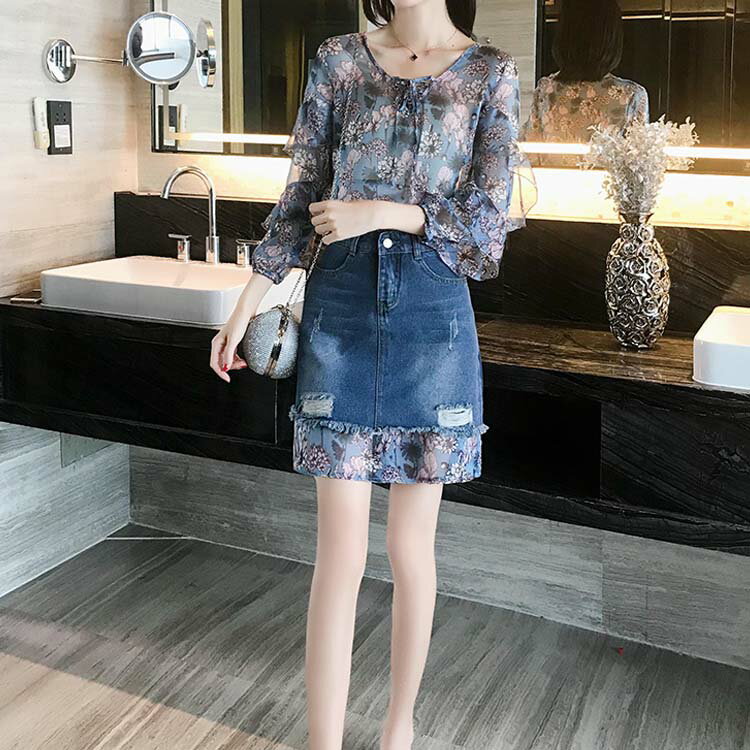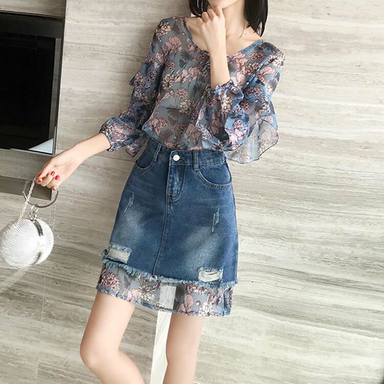 シフォンブラウス レディース デニムスカート 上下2点セット 半袖 ブラウス 花柄 長袖 七分丈袖 タイトスカート ミニスカート セットアップ送料無料