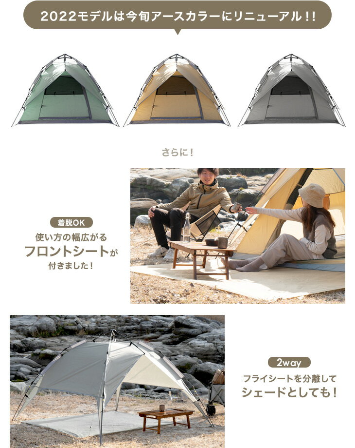 ※こちらの商品は2022年1月22日に【グランドシート付き】から【フロントシート付き】に仕様変更し、取り扱い色をアースカラーに一新しました。