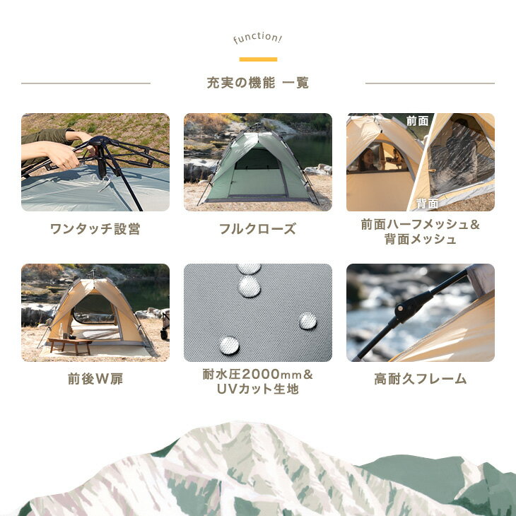 ▼ 大型のワンタッチテントもございます ▼ 4?5人用 幅300cm ▼コーディネートに使用したアイテムはこちら▼ ヘキサタープ フォールディングチェア キャリーワゴン 容量:100L レジャーテーブルセット フォールディング ラック 仕様サイズ 幅210×奥行210×高さ140cm (収納時:20×20×68cm)【スタッフわんちゃんのおすすめポイント!】 ・設置簡単 ワンタッチドームテント ・使い方の幅広がる着脱式フロントシート ・シェードとしても使える2way ・前後どちらからも出入り出来るW扉 ・開閉スムーズ両面ジップ ・熱がこもりにくいベンチレーション ・UVカット率98%以上のシルバーコーティング ・急な雨にも慌てない耐水圧2000mm ・虫の多い季節も安心のメッシュスクリーン ・フルクローズ仕様 ・小物の収納に便利なミニポケット ・ランタンフック付 ・キャンプサイトに溶け込むおしゃれなアースカラー セット内容 ・フライシート/インナーテント ・フロントシート・ペグ・ロープ・収納ケース・取扱説明書材質生地:ポリエステル フレーム:グラスファイバー ペグ:スチール ロープ:ポリエステル 重量 約3.5kg カラー サンドベージュ、アッシュグレー 、スモーキーグリーン梱包サイズ 幅70x奥行18x高さ18cm生産国中国送料【送料無料(沖縄県・離島は送料別途)】※沖縄県・離島の場合はお問い合わせください。