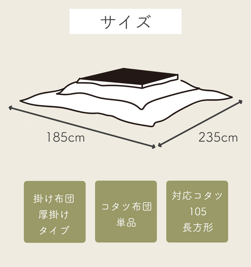 商品名:厚掛け 長方形こたつ布団 サイズ:W 185 × D 235 材 質:表生地:ポリエステル100%(撥水加工) 裏生地:綿100% 中綿:ポリエステル 中綿重量:約 2.0 kg 備 考:適応こたつ:105長方形 ※洗濯は不可。